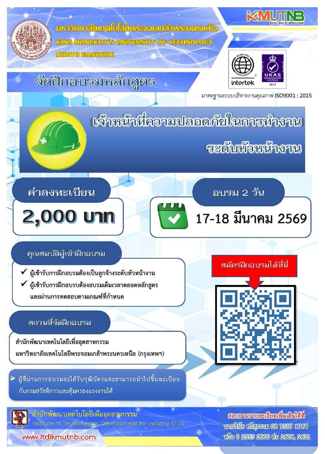 หลักสูตรการฝึกอบรม เจ้าหน้าที่ความปลอดภัยในการทำงานระดับหัวหน้างาน 12 ชั่วโมง รุ่นที่ 1/2569 วันที่ 17-18 มีนาคม 2569
